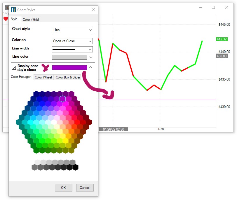 When the option Display prior day's close is checked, a horizontal line indicating yesterday's closing price will be added to your chart. Use the Color Hexagon, the Color Wheel or the Color Box & Slider to choose a color for the closing price line: