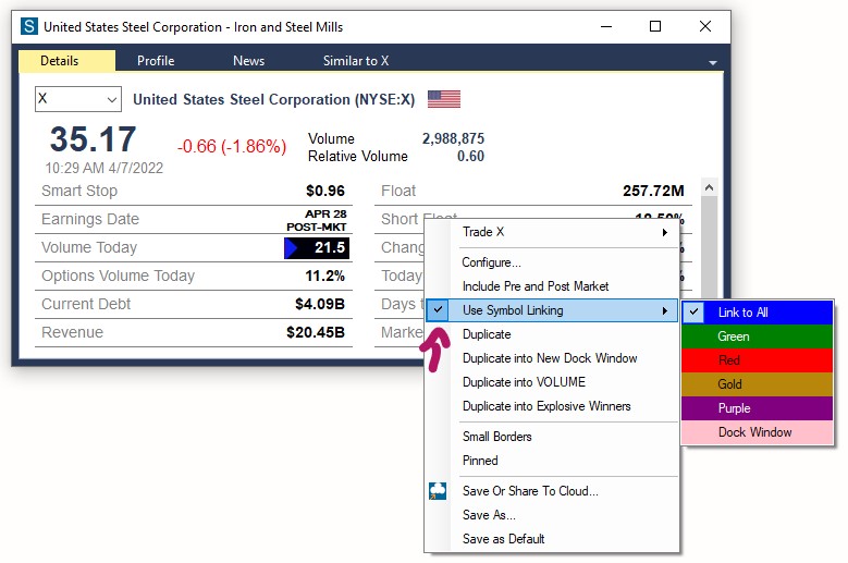 To enable Symbol Linking for a Single Stock Window, right-click into it, and select Symbol Linking.
