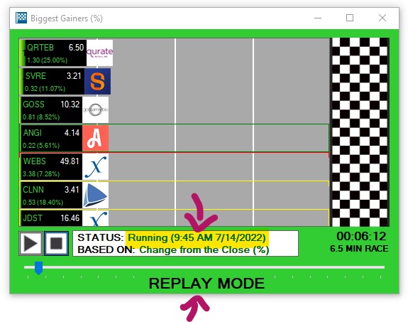 By default, races show the winners and losers in real-time. By switching to replay mode, you can recap entire trading days effortlessly in just a few minutes. One minute of replay reflects one whole trading hour. The exact settings of the Replay Mode will depend on your Trade Ideas version.