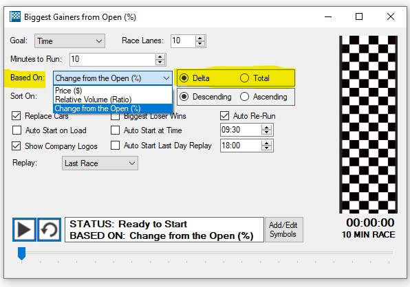 You can base the stock race on any filter that is part of your Top List. All available filters will be listed in the Based On dropdown.