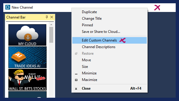 To do so in the Docked Channel Bar, right-click into the Docked Channel Bar Header and select Edit Custom Channels.