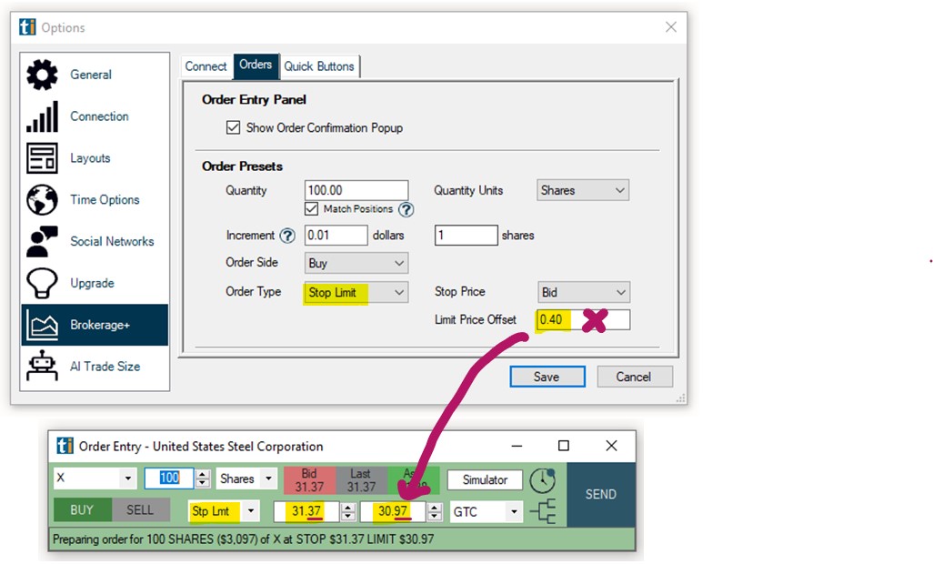 Example: If you entered Buy as your Order Side, Stop Limit as your Order Type and 0.40 as the Limit Offset Price, your Limit Order would be placed 40 cents below the chosen Stop Order Price as shown below: